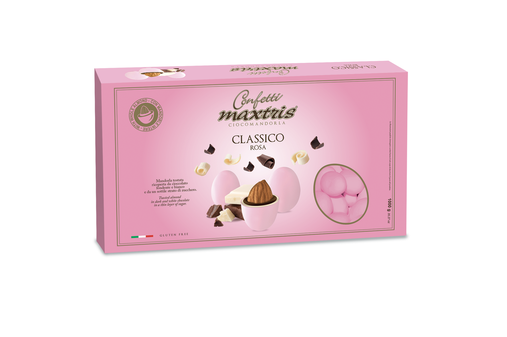 Confetti TWO MILK gusto CLASSICO ROSA  con anima morbida di cioccolato – 1 kg – disponibili in vari colori – e anche altre tipologie stesse tonalita’ o assortite -anche confezioni da mezzo kilo oppure da kilo incartati singoli in altre versioni –